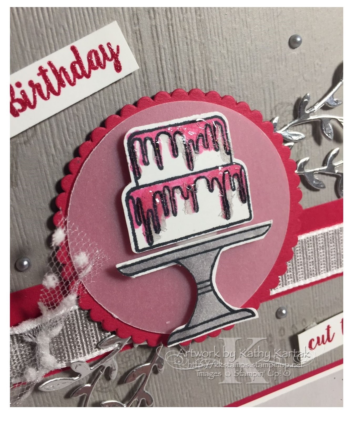 To finish the card, I stamped the sentiments from the "Piece of Cake" stamp set in Lovely Lipstick Ink onto Whisper White Card Stock. Working quickly, before the ink dried, I sprinkled on some Clear Stampin' Emboss Powder and set it with my Heat Tool. That's a Bonus Protip for you--emboss in any color. I used the Classic Label Punch to punch out the sentiments and snipped the ends. I adhered these to the card with Mini Stampin' Dimensionals. Finally, I added three silver Metallic Pearls, 'cause why not?