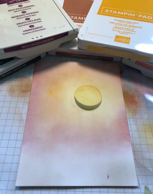 I watched a few videos of Stampin' Up demonstrators creating beautiful sunsets behind the trees so I set about to do the same. I cut a 1" circle from a Post-It note using one of the Layering Circles Dies and adhered it to a 3-3/4" by 5" Basic White Card Stock piece. I used a Blending Brush--yep, just one brush in all the colors, and nope, I didn't clean it in between since the inks don't [usually] transfer from the brush--to swirl on Mango Melody, Calypso Coral, Cinnamon Cider, and Blackberry Bliss Inks. I also added Mossy Meadow Ink along the bottom to "ground" the trees.